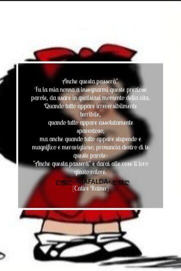 Fu la mia nonna a insegnarmi queste preziose parole, da usare in qualsiasi momento della vita. Quando tutto appare irreversibilmente terribile. Quando tutto appare assolutamente spaventoso, ma anche quando tutto appare stupendo e magnifico e meraviglioso, pronuncia dentro di te queste parole…anche questa passerà…e darai alle cose il loro giusto valore Calire Rainer